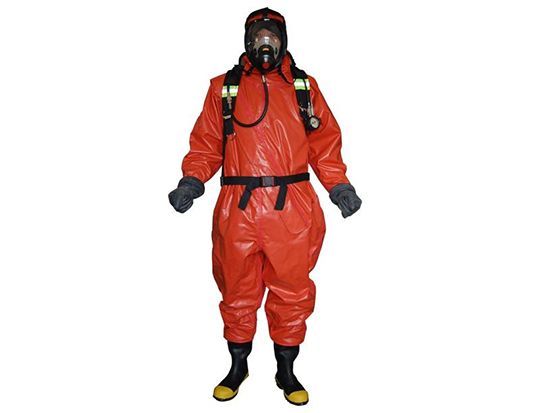 氣密重型防化服,雙面Hypalon?涂層面料(550g/m2),組件和接縫采用內(nèi)/外部雙硫化密封,帶有高氣密性密封拉鏈,高強度、抗沖擊、高清晰度面屏,頭部后面配置雙排氣閥門。防護(hù)時間:防較強滲透性溶劑(甲苯等)、強酸堿(96%硫酸等)或強穿透性毒劑(芥子氣等)的時間≥2小時,防化靴防毒時間≥5小時,抗多種高濃度化學(xué)試劑滲透長達(dá)8小時以上,卓越的防酸堿性能,防火阻燃,耐UV/臭氧、抗曲饒龜裂、耐磨、防霧、防固體顆粒,浸水2小時以上不滲水,拉伸強度:徑向、緯向≥20KN/m。在-40℃~35℃范圍內(nèi)可正常使用,保證穿著者的舒適及安全。